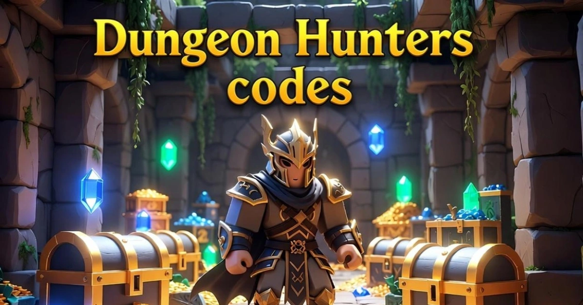 Realistic Roblox-style dungeon scene featuring a heroic character in armor holding a sword, surrounded by glowing Gems and treasure chests. The image includes the text 'Dungeon Hunters Codes' prominently, representing in-game rewards and code redemption.